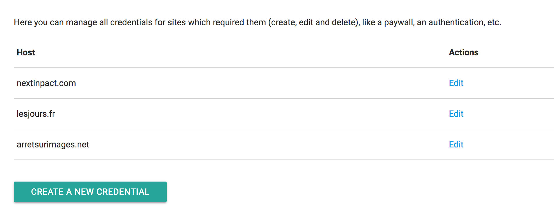 In Site credentials, you need to create a new credential by typing the domain name (without the https://www. part – we'll improve it soon), your username and your login. All is encrypted in your database. If you want more details, you can read the specifications here.